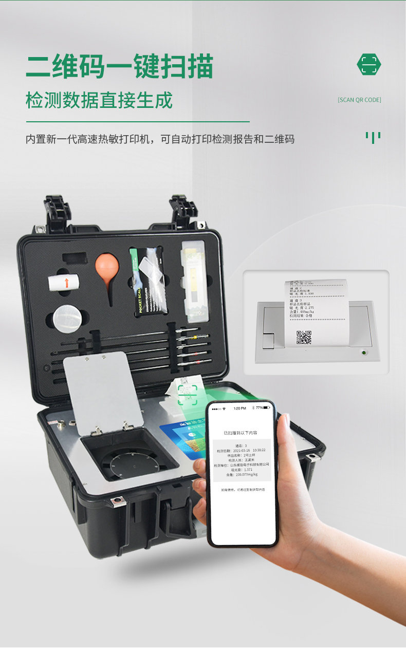 14、內置新一代高速熱敏打印機(無需色帶),打印內容包含:檢測單位、檢測人員、檢測項目、通道號、吸光度、養(yǎng)分含量(mg/kg)、檢測時間、以及二維碼等信息