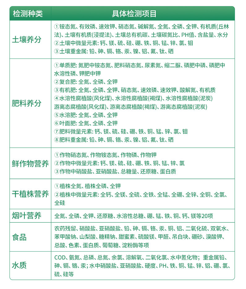 2、肥料養(yǎng)分:●單質肥:氮肥中銨態(tài)氮、肥料硝態(tài)氮、尿素氮、縮二脲、磷肥中磷、磷肥中水溶性磷、鉀肥中鉀;●復合肥全氮、復合肥全磷、復合肥全鉀;●有機肥全氮、有機肥全磷、有機肥全鉀、有機肥硝態(tài)氮、有機肥速效磷、有機肥速效鉀、有機肥酸解氮、有機質;●水溶性腐植酸(風化煤)、水溶性腐植酸(褐煤)、水溶性腐植酸(泥炭)、游離態(tài)腐植酸(風化煤)、游離態(tài)腐植酸(褐煤)、游離態(tài)腐植酸(泥炭);●水溶肥全氮、水溶肥全磷、水溶肥全鉀;●葉面肥全氮、葉面肥全磷、葉面肥全鉀;●各種肥料微量元素:肥料鈣、肥料鎂、肥料硫、肥料硅、肥料硼、肥料鐵、肥料銅、肥料錳、肥料鋅、肥料氯、肥料鉬;●肥料重金屬:肥料鉛、肥料砷、肥料鎘、肥料鉻、肥料汞、肥料鎳、肥料鋁、肥料氟、肥料鈦、肥料硒。